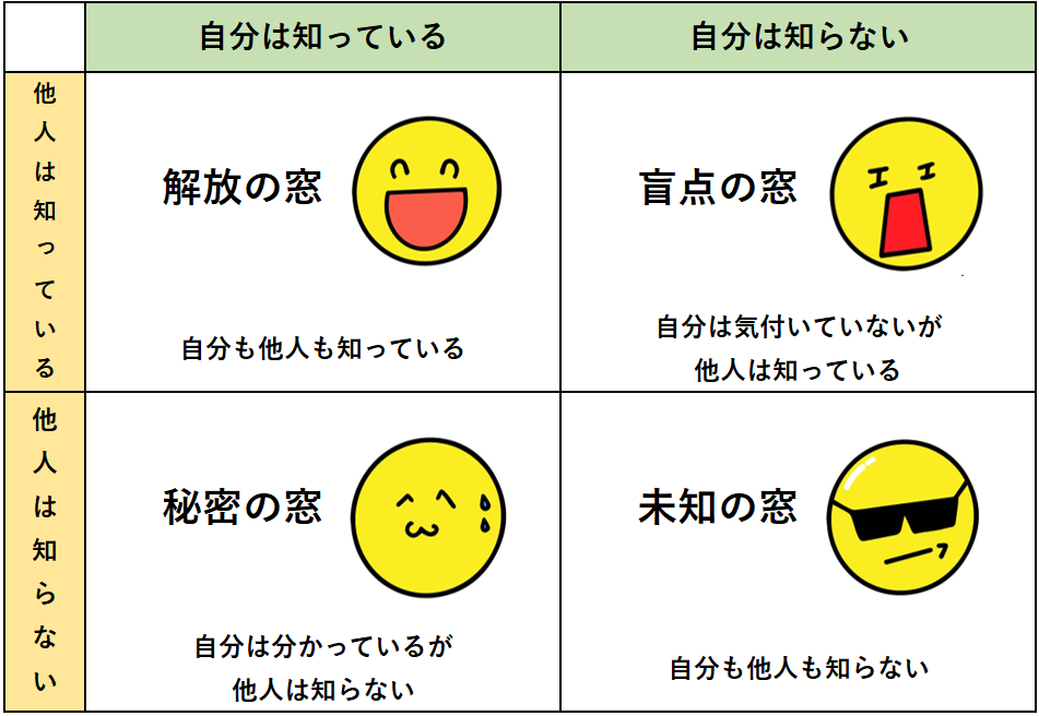 しかし、褒める際にポイントにしてもらいたいのが、心理学者のジョセフ・ルフト氏とハリー・インガム氏の共同研究で発表した「ジョハリの窓」を意識することです。