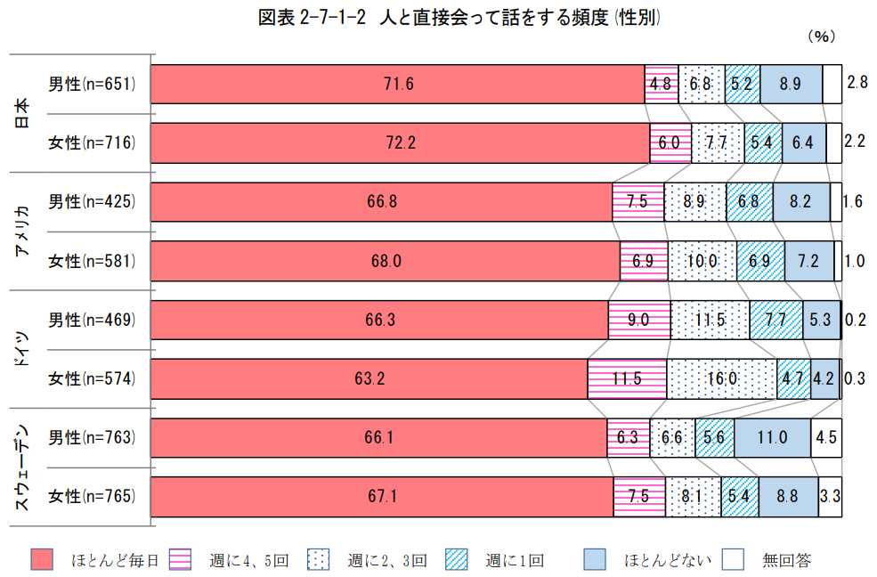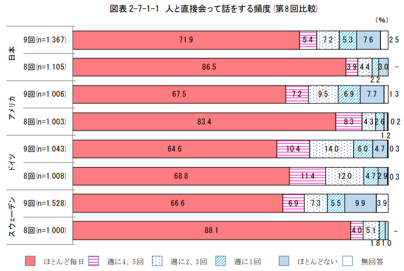 同居の家族やホームヘルパーなども含めて「普段どのくらいの人と直接会って話をするか?」という質問に対して、前回調査と比較してみると「ほとんど毎日」の回答は第8回(平成27年)86.5%から第9回(令和2年)71.9%と減少しており、他の国も同様に減少しています。