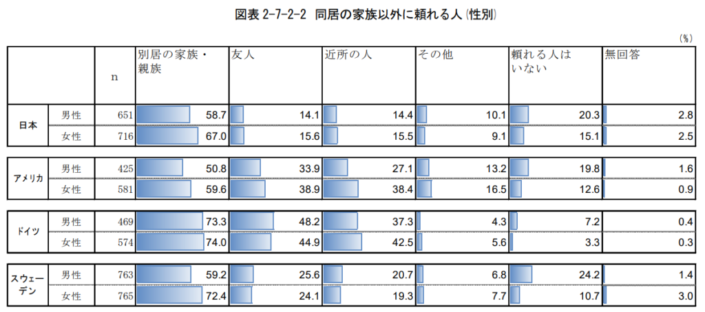 病気や一人ではできない作業などに出くわした時に、同居の家族以外に頼れる人はいるのか?という質問に対して、別居の家族や親族が大半を占めていますが、男女全体で見ると次に多いのは「頼れる人がいない」と回答がありました。