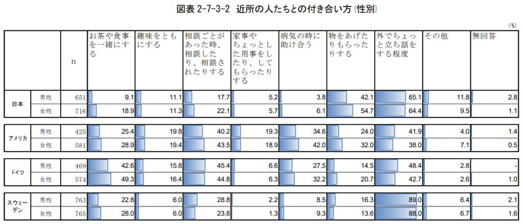 近所付き合いに関する質問では、「外でちょっと立ち話をする程度」が多く、次に「物をあげたりもらったりする」と回答があるものの、深い付き合いがあるような関係が少ないような印象が感じられます。