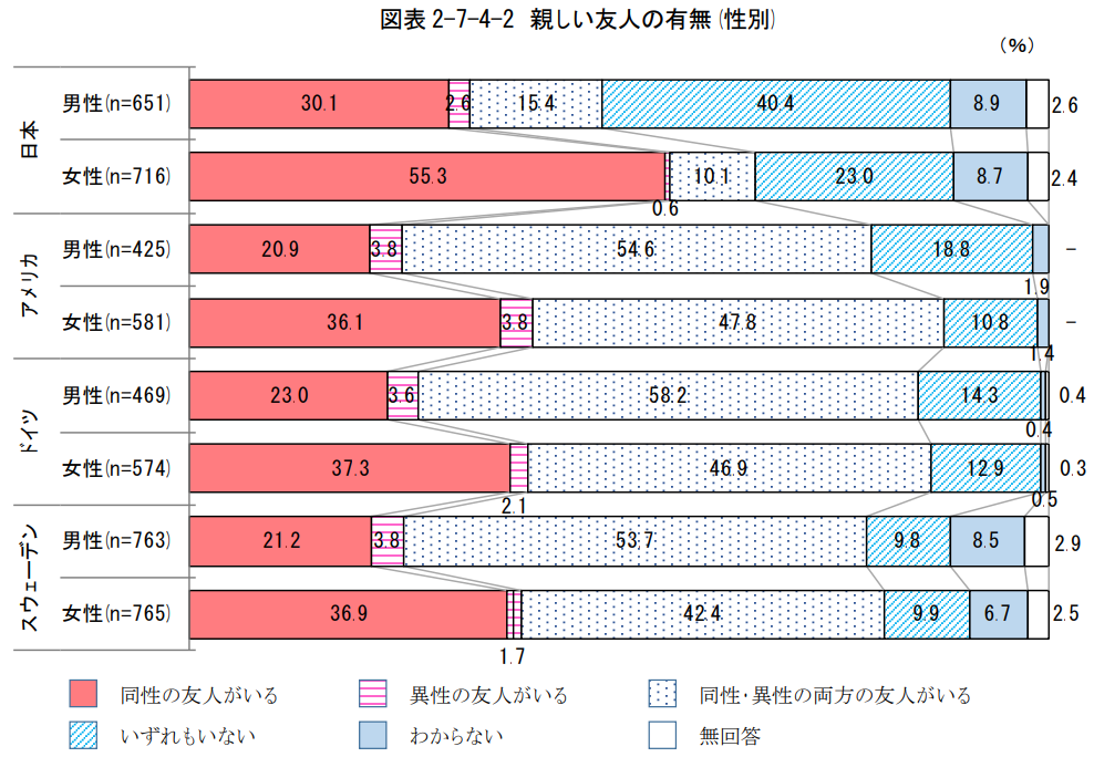 友人関係についての質問では、女性は「同性の友人がいる」に半数が回答していますが、男性は「いずれもいないや分からない」が半数を占めていました。